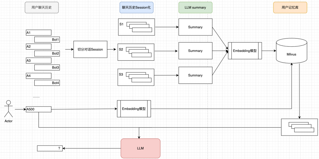 用户和AI角色的聊天历史,首先会切分成对话session,每个session作为一个chunk,利用LLM在session上抽取对话摘要,然后构建摘要的向量索引存储到 Milvus中。