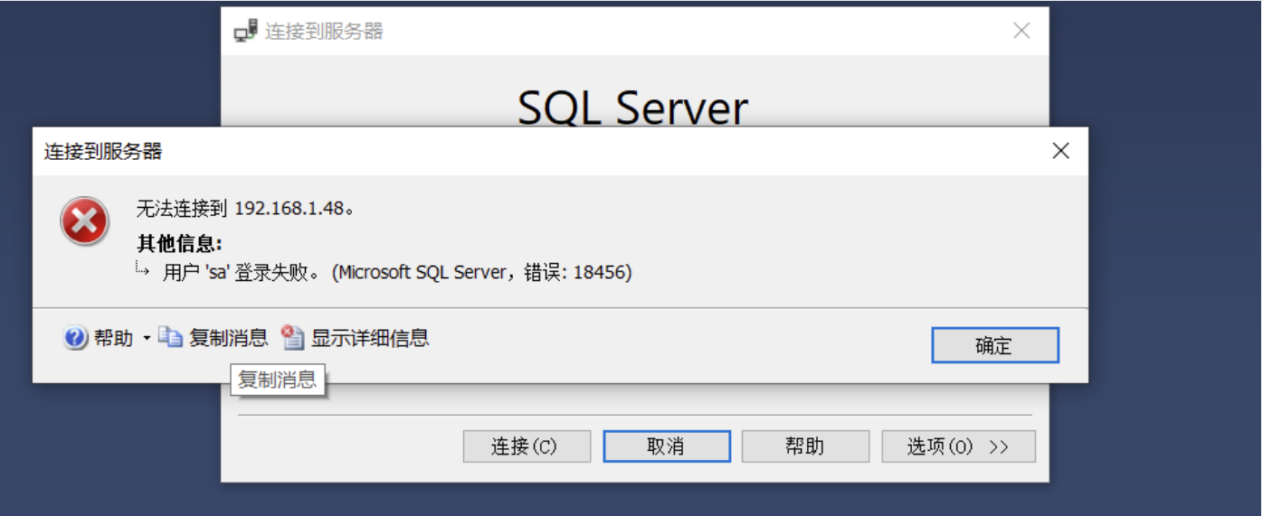 要是正常的话,这个时候大概是可以通过manegement studio连上的,但是发现Windows Authentication可以登陆,但是 SQL Server Authentication却不能登陆。