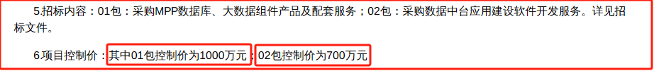 招标内容:预算1000万采购MPP数据库,700万采购数据中台软件开发。