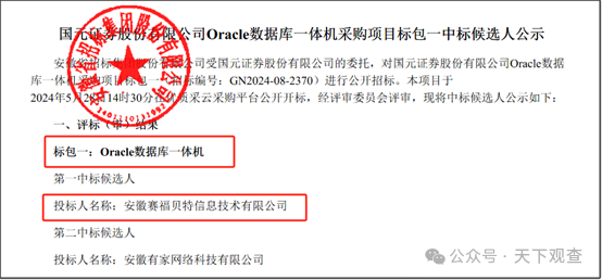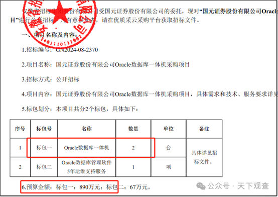 即便信创进行了多年,很多核心业务依然源源不断的采购Oracle数据库一体机设备。例如,国元证券2024年5月29日公告,采购Oracle数据库一体机,该项目预算890万元,公告中未透露中标价格。