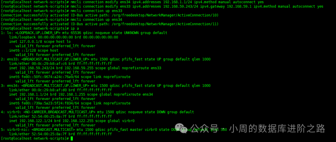 nmcli connection modify ens33 ipv4.addresses 192.168.59.244/24 ipv4.gateway 192.168.59.1 ipv4.method manual autoconnect yes