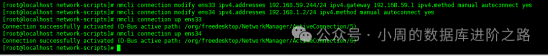 nmcli connection modify ens34 ipv4.addresses 192.168.1.2/24 ipv4.method manual autoconnect yes