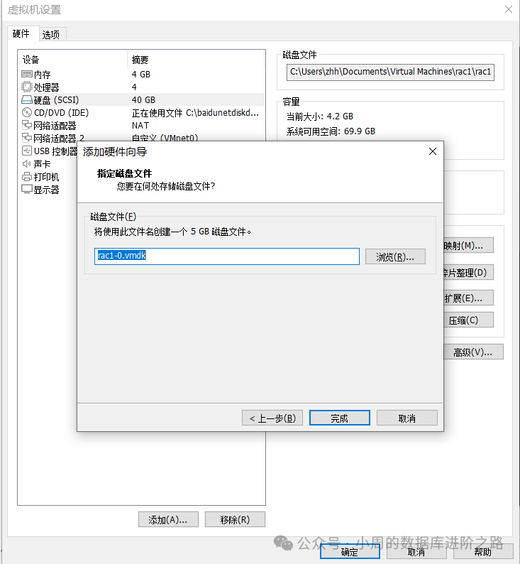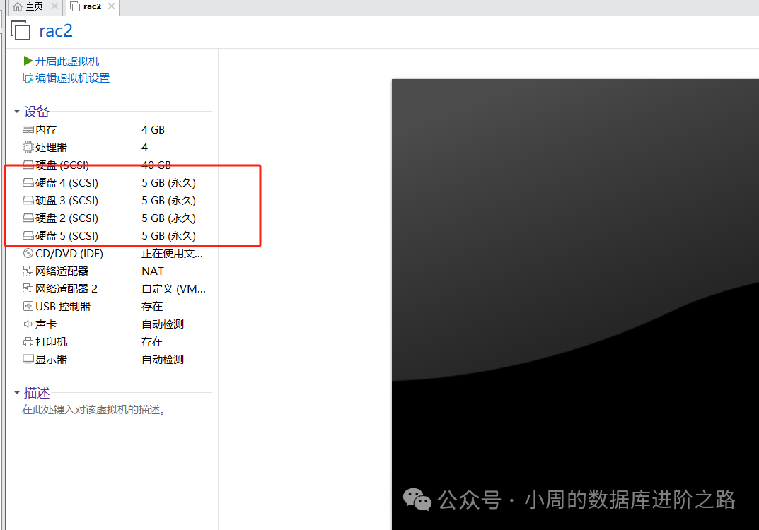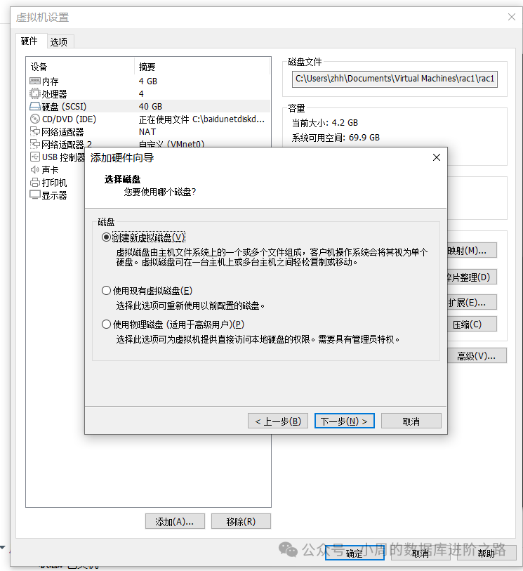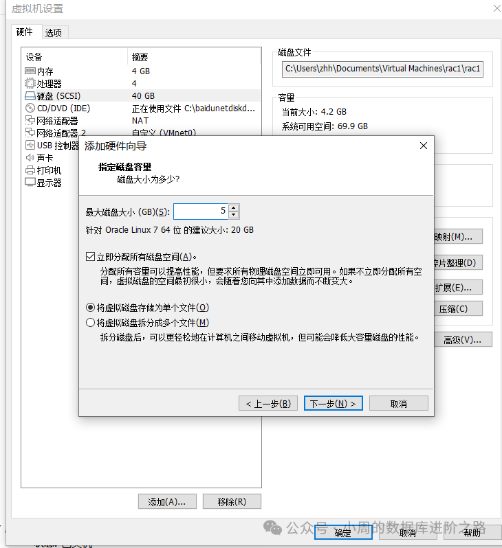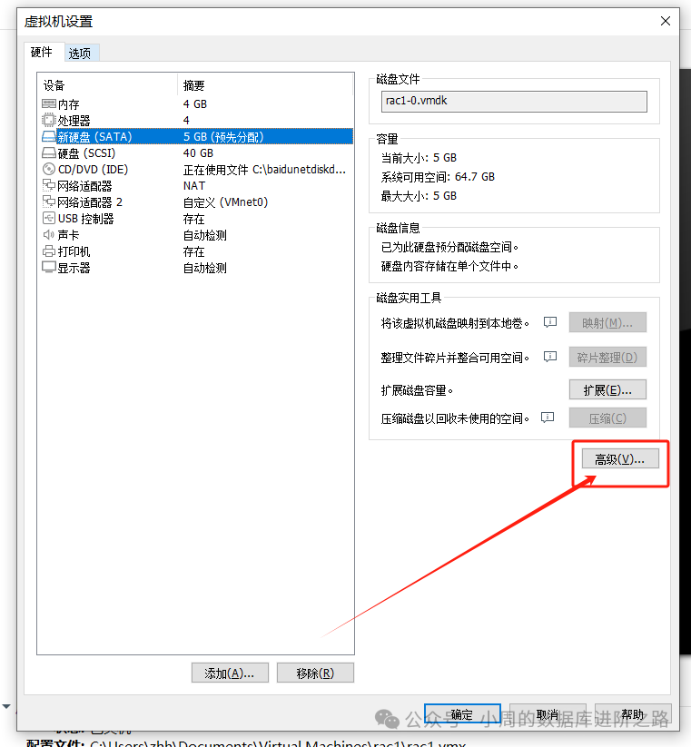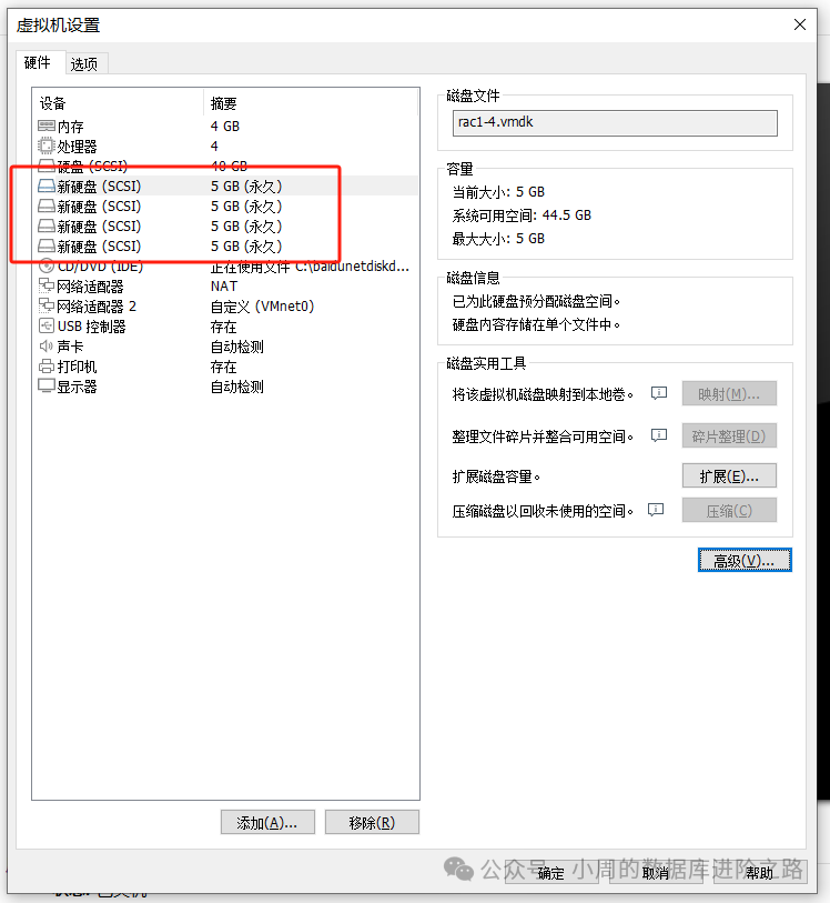 在VMvare虚拟机上添加共享存储。本例OCR 盘采用 normal 冗余,数据文件盘采用 external 冗余,故需要3 块 20G 且没有挂载的 SATA 可共享磁盘作为 OCR,1 块 50G 且没有挂载的SATA 可共享磁盘作为数据文件存储。