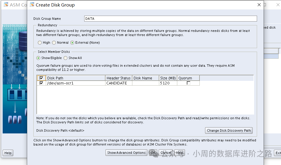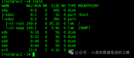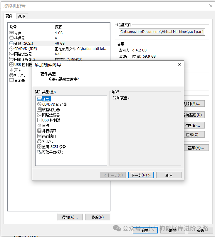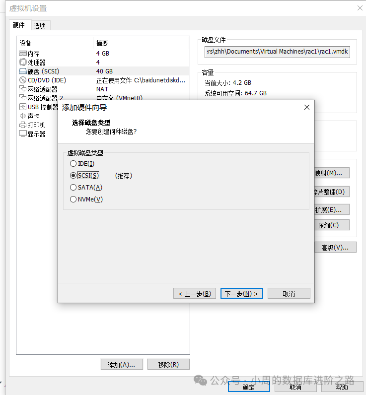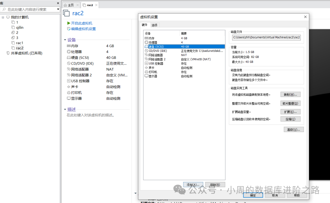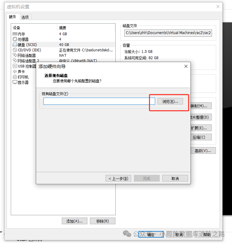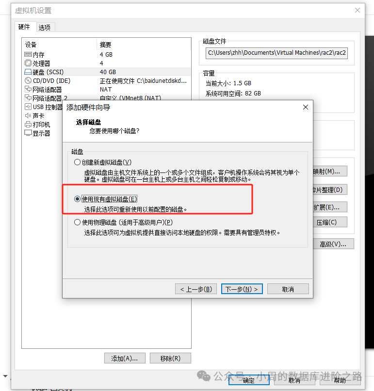 在VMvare虚拟机上添加共享存储。本例OCR 盘采用 normal 冗余,数据文件盘采用 external 冗余,故需要3 块 20G 且没有挂载的 SATA 可共享磁盘作为 OCR,1 块 50G 且没有挂载的SATA 可共享磁盘作为数据文件存储。