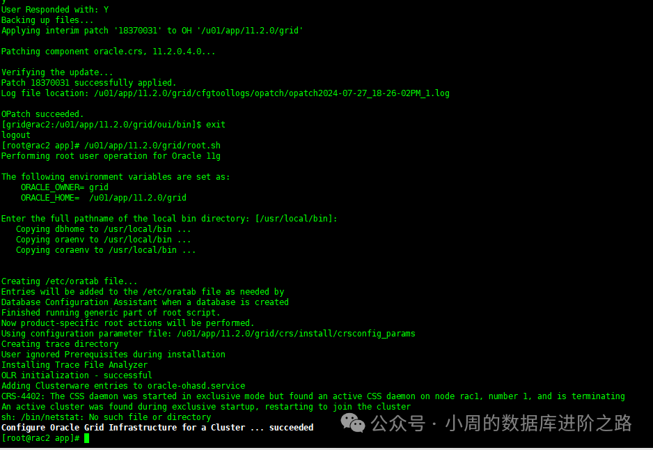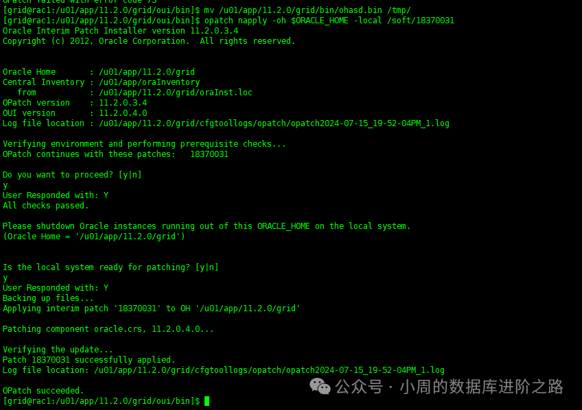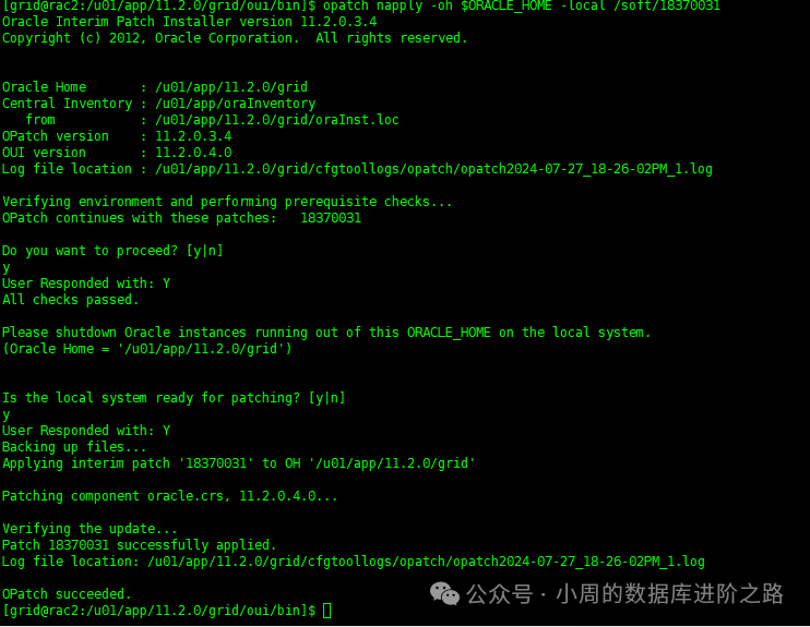 [grid@rac2:/u01/app/11.2.0/grid/oui/bin]$opatch napply -oh $ORACLE_HOME -local /soft/18370031
