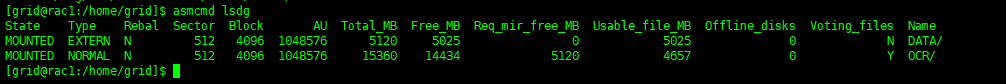 [grid@rac1:/home/grid]$ asmcmd lsdg