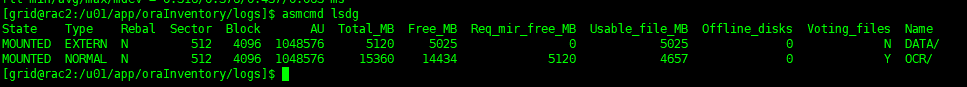 [grid@rac2:/u01/app/oraInventory/logs]$ asmcmd lsdg