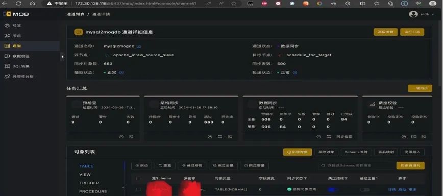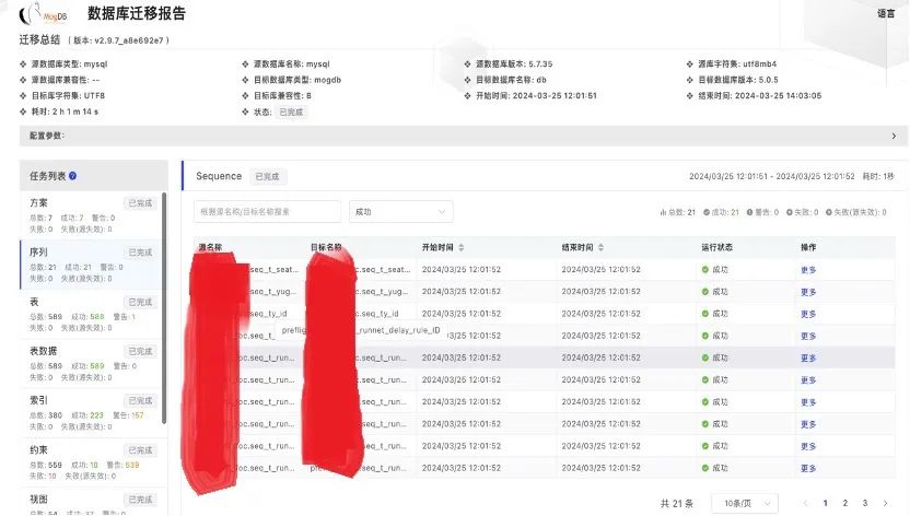 可以看到整个mtk迁移耗时2h多一点,其中涉及到7个schema,一共是589个表,均迁移成功。