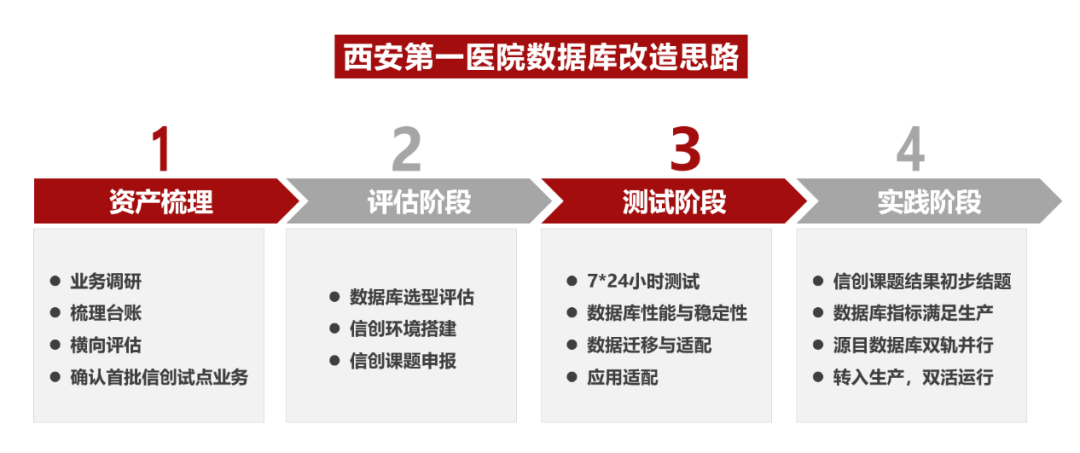医院经过谨慎的调研,对信创改造制定详实的推进计划,开展充分的数据库和业务测试,在国产数据库合作伙伴的选择上也有一套清晰的评估标准。