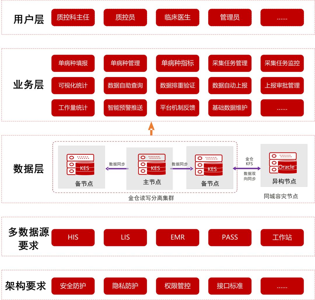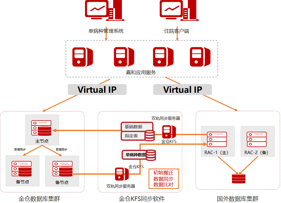 由于医院的单病种质量管理与上报系统隶属电子病历的内部模块,因此单病种上报系统的数据库与电子病历生产库为同一数据库。本项目将电子病历数据库双向同步到金仓数据库后,将单病种模块业务定向到金仓,而Oracle承接其他模块。