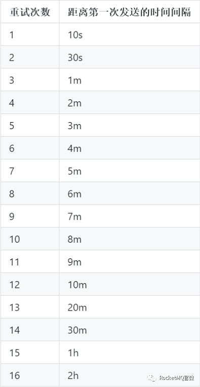 这里介绍一下Apache RocketMQ的重试时间窗,当消息需要重试时,会按照该规则进行重试。