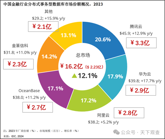 7月18日,国际数据公司(IDC)发布了《中国金融行业分布式事务型数据库市场份额,2023》,报告显示,2023年,中国金融行业分布式事务型数据库的总市场规模约为16.2亿人民币(2.23亿美元),同比增长12.1%。