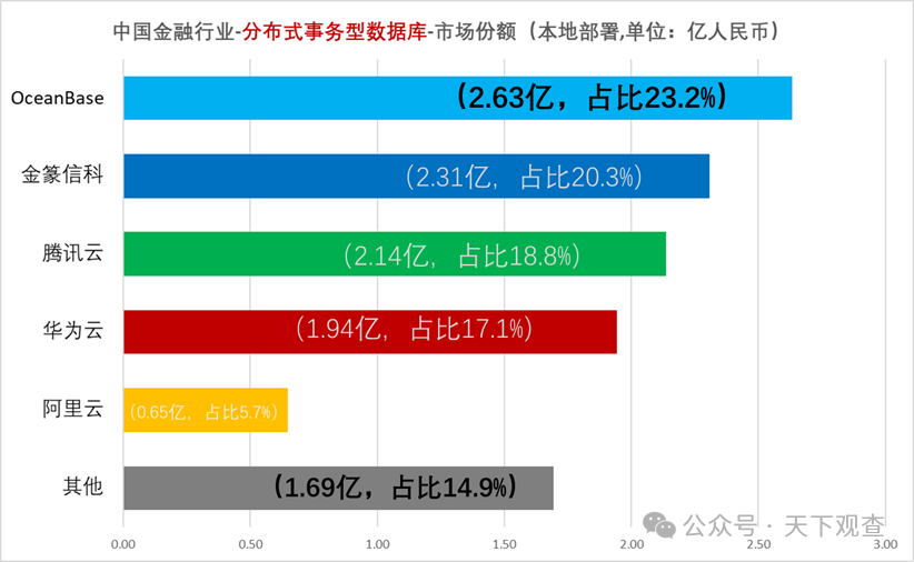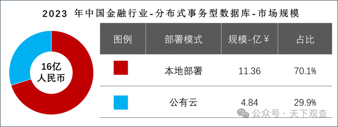 从报告数据显示,市场头部格局形成,五军之战正式拉开帷幕,腾讯云、华为云、阿里云、OceanBase、金篆信科(中兴),共同瓜分了13.9亿人民币,占比86.9%的市场份额。剩下的厂商(可能有近百家)只分得2亿人民币,约占13.1%的市场,总和都赶不上“五军”中的任何一家,市场竞争变得异常惨烈!而作为通用型基础软件,头部效应会越发明显,未来这一领域的“战争”很可能将集中在这“五军”之间。中尾部厂商的生存空间在未来很可能进一步被压缩,“求变”、“求生”将成为企业发展的关键词。再回来看报告数据,云厂商的(云上)市场份额计算相对复杂,包含了基础云资源成本在内,对数据库技术本身的参考性相对较弱,所以本地部署的市场份额更能体现出金融机构对数据库的投入态度。报告数据:2023 年中国金融行业分布式事务型数据库本地部署的整体市场规模为11.36亿人民币(1.56 亿美元),占整体市场的 70.1%。
