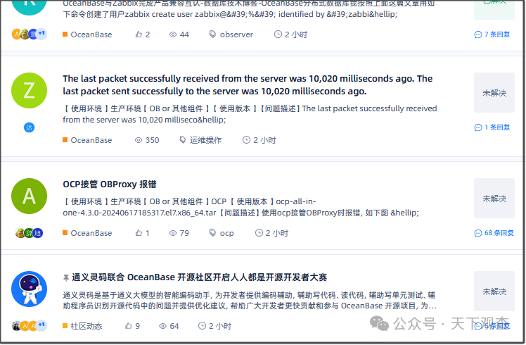 除了图形化安装工具,还提供obd集群命令行管理工具,启停、运维数据库集群就一条命令,以及可视化运维监控工具。而这些所有的工具都可以在数据库安装时勾选,进行一键安装。没有任何分布式数据库理论基础的人,也能花费少量的精力部署、应用一套分布式的OceanBase。OB在线文档做的非常完善,社区活跃度非常高,几乎每天都会有4/50个新的帖子在问答模块创建,数百人参与互动,这在目前整个国产数据库行业中都是极其少见的。不管是完善的文档还是高互动性的问答社区,用户使用的时候也不用担心除了找原厂工程师,就没有交流沟通、解决问题的渠道了。