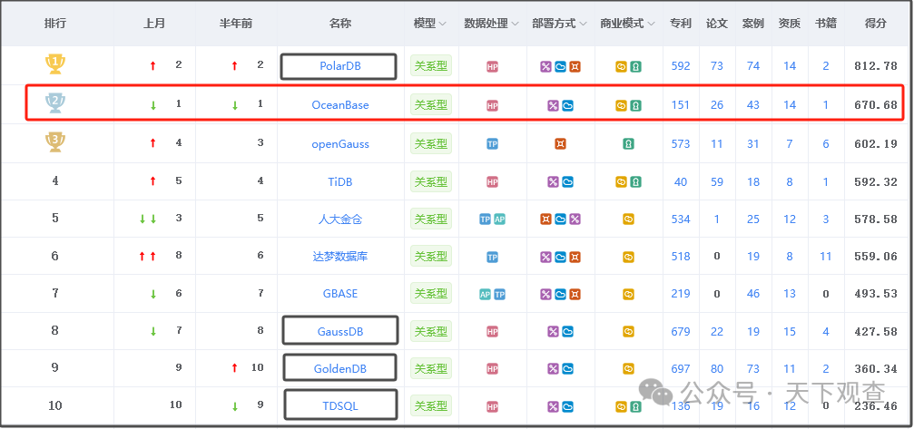 OB在墨天轮的数据库流行度排名中,始终位居前列,经常霸榜。