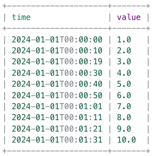 CREATE TABLE wzz (value DOUBLE);INSERT INTO wzz VALUES ('2024-01-01T00:00:00.000', 1.0),('2024-01-01T00:00:10.000', 2.0),('2024-01-01T00:00:19.000', 3.0),('2024-01-01T00:00:30.000', 4.0),('2024-01-01T00:00:40.000', 5.0),('2024-01-01T00:00:50.000', 6.0),('2024-01-01T00:01:01.000', 7.0),('2024-01-01T00:01:11.000', 8.0),('2024-01-01T00:01:21.000', 9.0),('2024-01-01T00:01:31.000', 10.0);