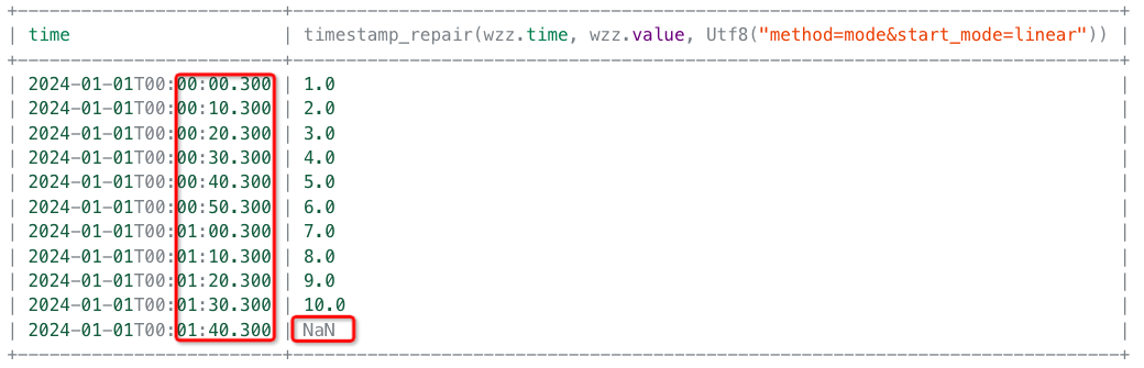 SELECT timestamp_repair(time, value, 'method=mode&start_mode=linear') FROM wzz;