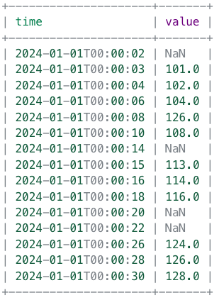 CREATE table wzz(value double);INSERT wzz VALUES ('2024-01-01T00:00:02',acos(3)),('2024-01-01T00:00:03',101.0),('2024-01-01T00:00:04',102.0),('2024-01-01T00:00:06',104.0),('2024-01-01T00:00:08',126.0),('2024-01-01T00:00:10',108.0),('2024-01-01T00:00:14',acos(3)),('2024-01-01T00:00:15',113.0),('2024-01-01T00:00:16',114.0),('2024-01-01T00:00:18',116.0),('2024-01-01T00:00:20',acos(3)),('2024-01-01T00:00:22',acos(3)),('2024-01-01T00:00:26',124.0),('2024-01-01T00:00:28',126.0),('2024-01-01T00:00:30',128.0);