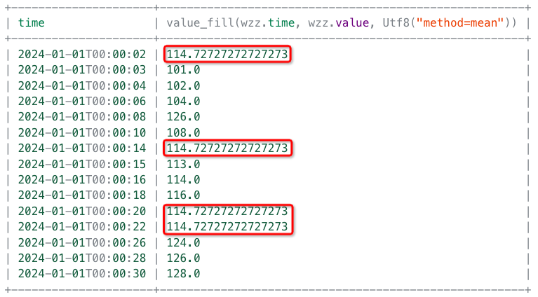 SELECT value_fill(time, value, 'method=mean') FROM wzz;