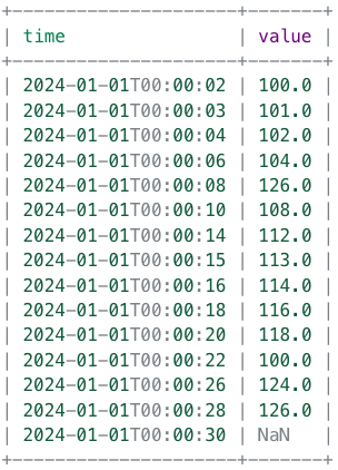 CREATE table wzz(value double);INSERT wzz VALUES ('2024-01-01T00:00:02',100.0),('2024-01-01T00:00:03',101.0),('2024-01-01T00:00:04',102.0),('2024-01-01T00:00:06',104.0),('2024-01-01T00:00:08',126.0),('2024-01-01T00:00:10',108.0),('2024-01-01T00:00:14',112.0),('2024-01-01T00:00:15',113.0),('2024-01-01T00:00:16',114.0),('2024-01-01T00:00:18',116.0),('2024-01-01T00:00:20',118.0),('2024-01-01T00:00:22',100.0),('2024-01-01T00:00:26',124.0),('2024-01-01T00:00:28',126.0),('2024-01-01T00:00:30',acos(3));