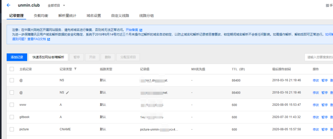 其中记录值是在七牛云添加CDN域名加速时获得的CNAME值,鼠标停留在域名上即可获得。