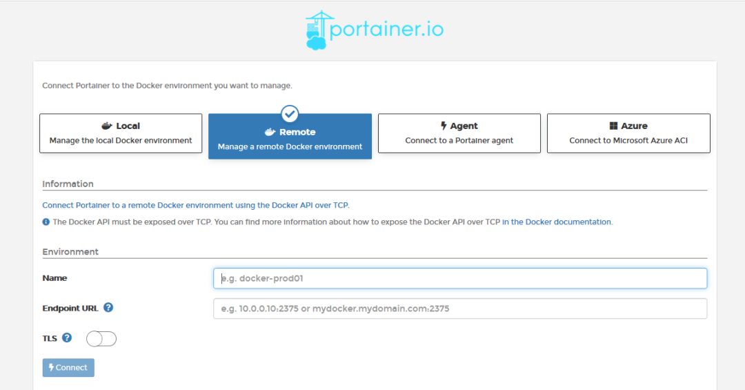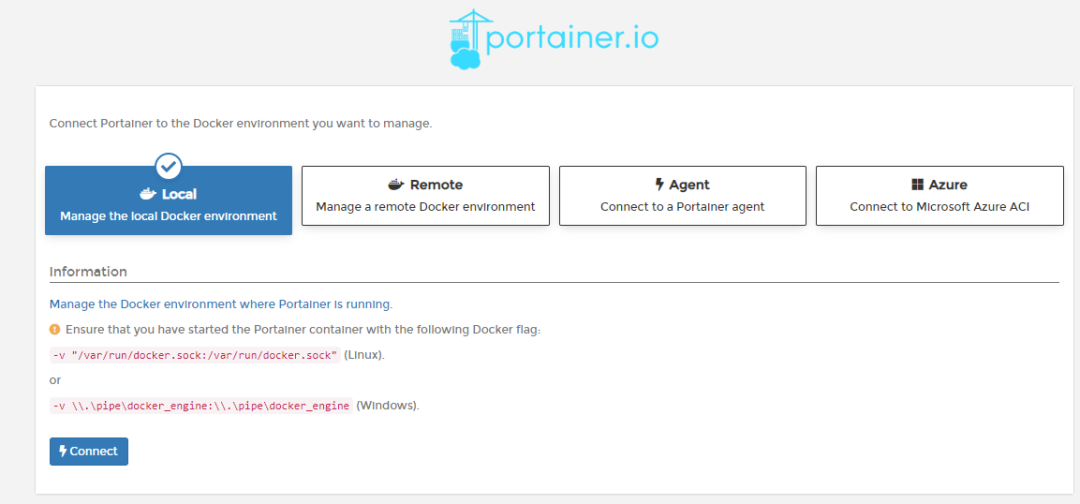 选择管理模式,由于这里是单台Docker主机,我们选择Local 本机即可