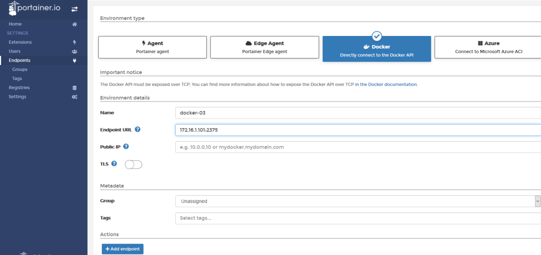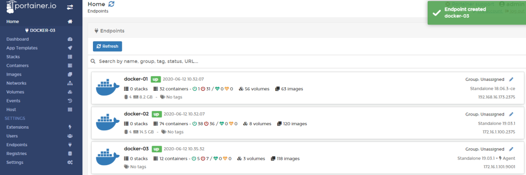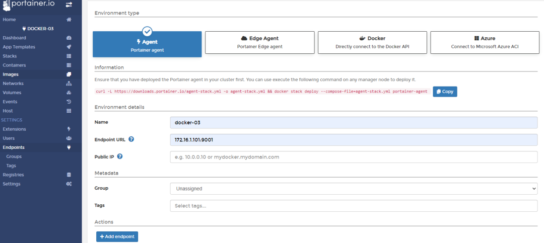 点击Endpoints菜单通过Docker API 添加其他Docker主机