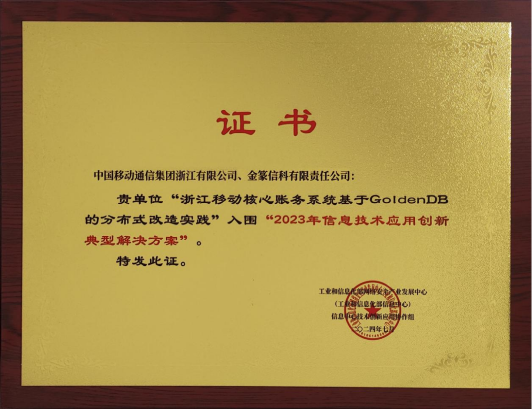 大会发布了2023年信息技术应用创新典型解决方案,浙江移动联合中兴通讯金篆GoldenDB申报的“浙江移动核心账务系统基于GoldenDB的分布式改造实践”成功入围!