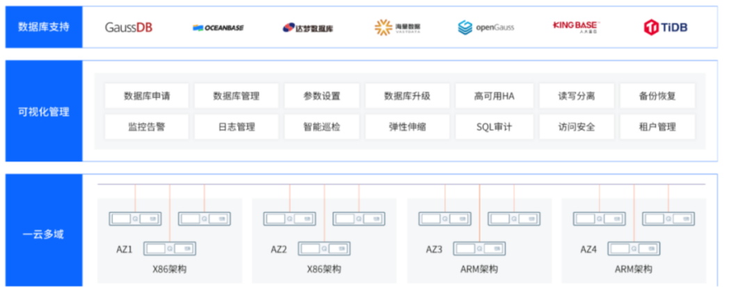 沃趣科技基于云原生技术推出的多类型国产数据库私有云解决方案,打造一站式数据库私有云,产品适配鲲鹏、海光、飞腾等芯片,银河麒麟、欧拉等操作系统以及华为、曙光、浪潮等国产服务器,支持GaussDB、openGauss、OceanBase、海量、达梦、TiDB、人大金仓等国产数据库,可以帮助企业自主选择使用国产数据库服务,实现企业信创化的快速转型升级,加快推进并支撑国产数据库应用落地。