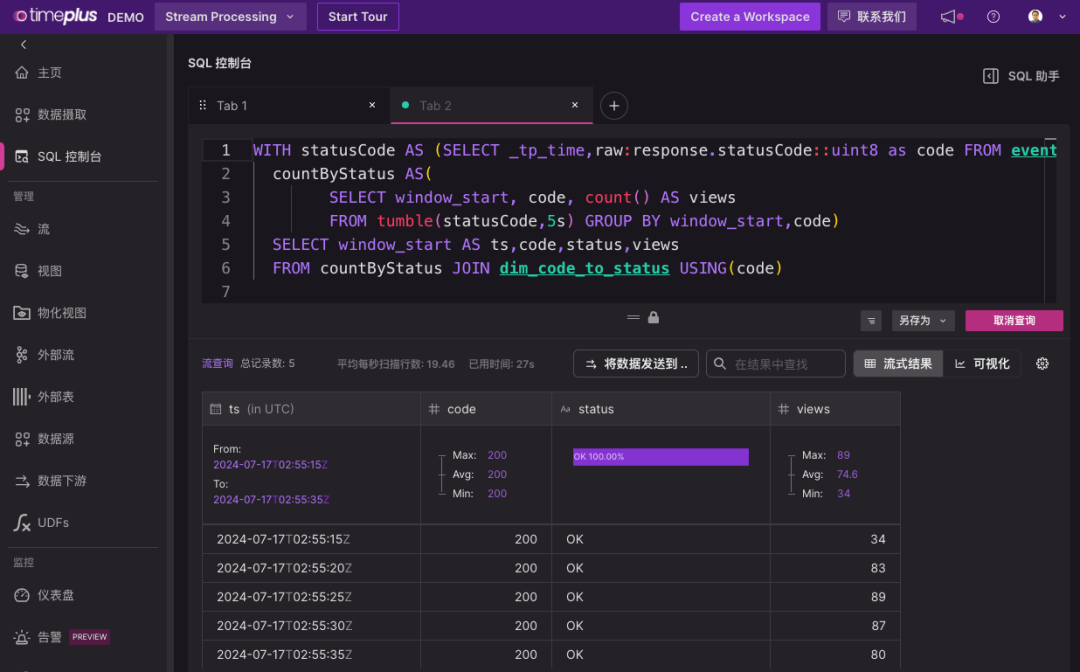 Timeplus 提供易用而强大的可视化界面,可以直观的探索实时数据,把握数据特征,和创建实时大屏。