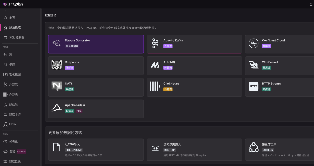 然后,选择数据摄取界面(左边导航栏第二条),选择连接 Kafka 等数据源。也可以选择第一个选项来生成实时数据来体验流数据查询。