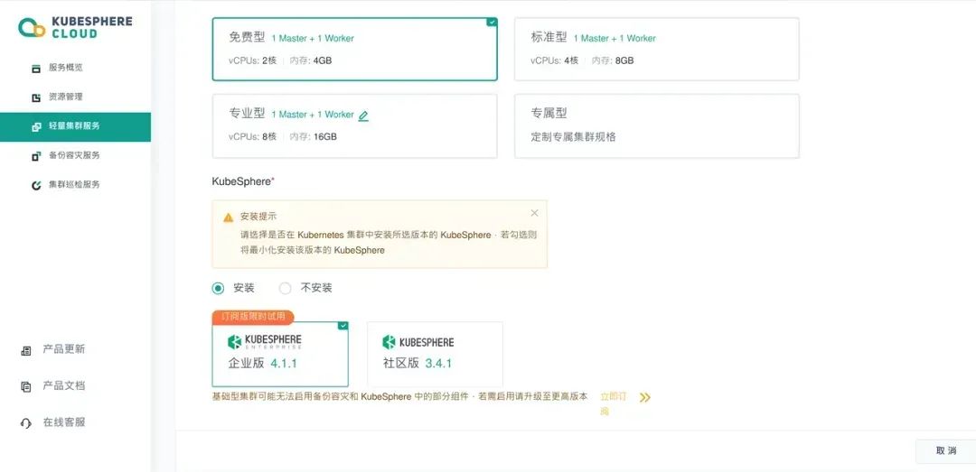 现在借助 KubeSphere,用户可以更加轻松地运行和使用 Timeplus 的解决方案,从而降低部署和运维的成本,实现资源的高效利用。要在 KubeSphere 中使用 Timeplus,您需要:订阅 KubeSphere 企业版之后,即可部署和激活 KSE。如果使用 KubeSphere Cloud,可以在新建轻量集群时勾选企业版 。安装指南可以参考 https://docs.kubesphere.com.cn/v4.1.1/03-installation-and-upgrade/ 初次使用可享受 30 天免费订阅。