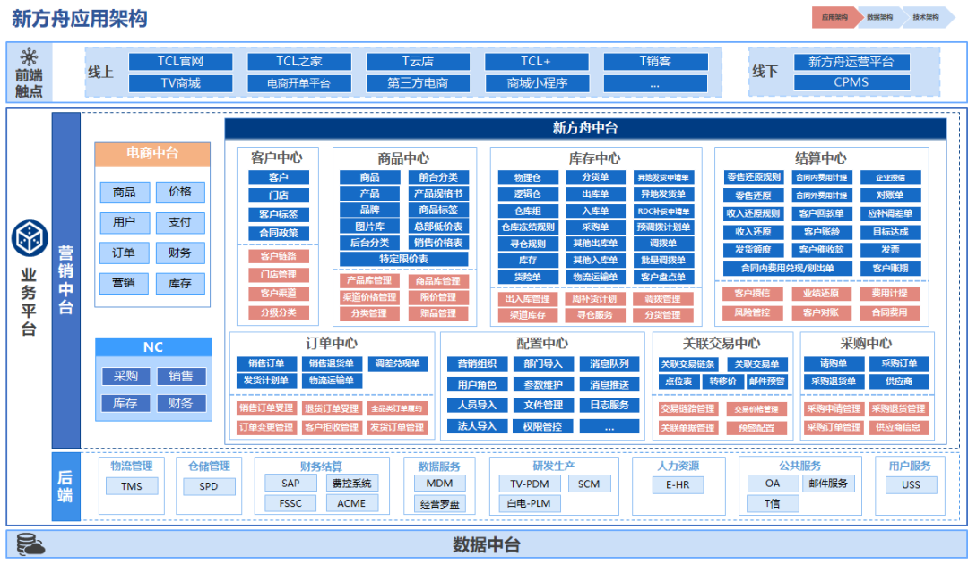 目前,TiDB 集群已支撑 TCL 实业近 20 个业务中心,新方舟应用架构涵盖 40 个业务触点、13 个业务场景、 8 个业务中心、680 个功能。应用架构图如下: