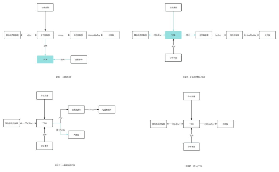 以下是切换 TiDB 的整体流程,TiDB 切换流程简化了架构,无需分片规则,所有数据集中于单一集群,原 MySQL 综合库查询也迁移至 TiDB 。