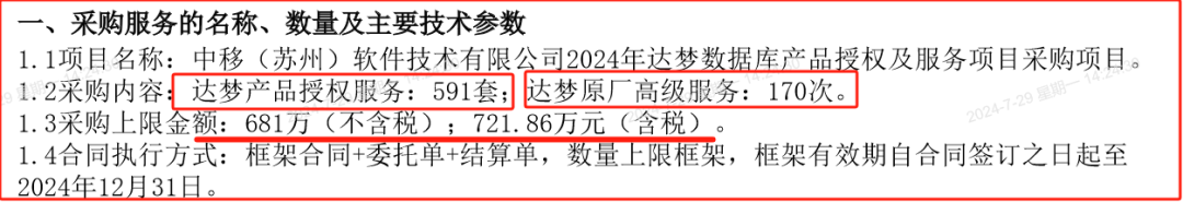 中移(苏州)软件:预算721万 达梦591套+170次高级服务2024-7-23