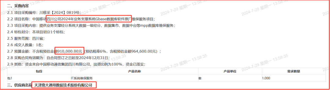 四川移动:预算91万 Gbase 原厂维保 2024-7-23
