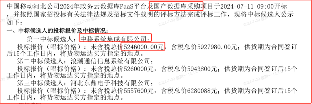 河北移动: 524万采购80套集中式数据库(中移系统集成中) 202407-12