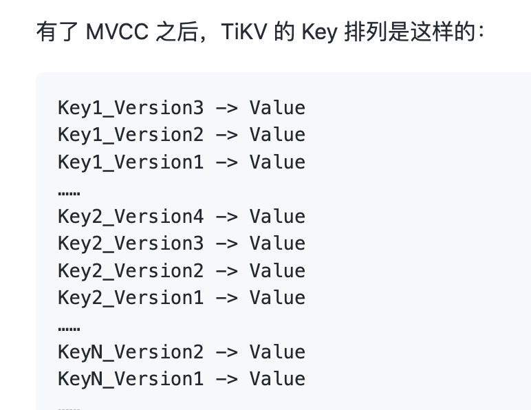 TiKV 使用 MVCC 机制来处理并发控制和历史数据版本,每个事务都会获取一个全局唯一的时间戳(TS)作为版本号。 通过这种方式,TiKV 可以支持同一时间点的多个事务读取到一致的数据快照。