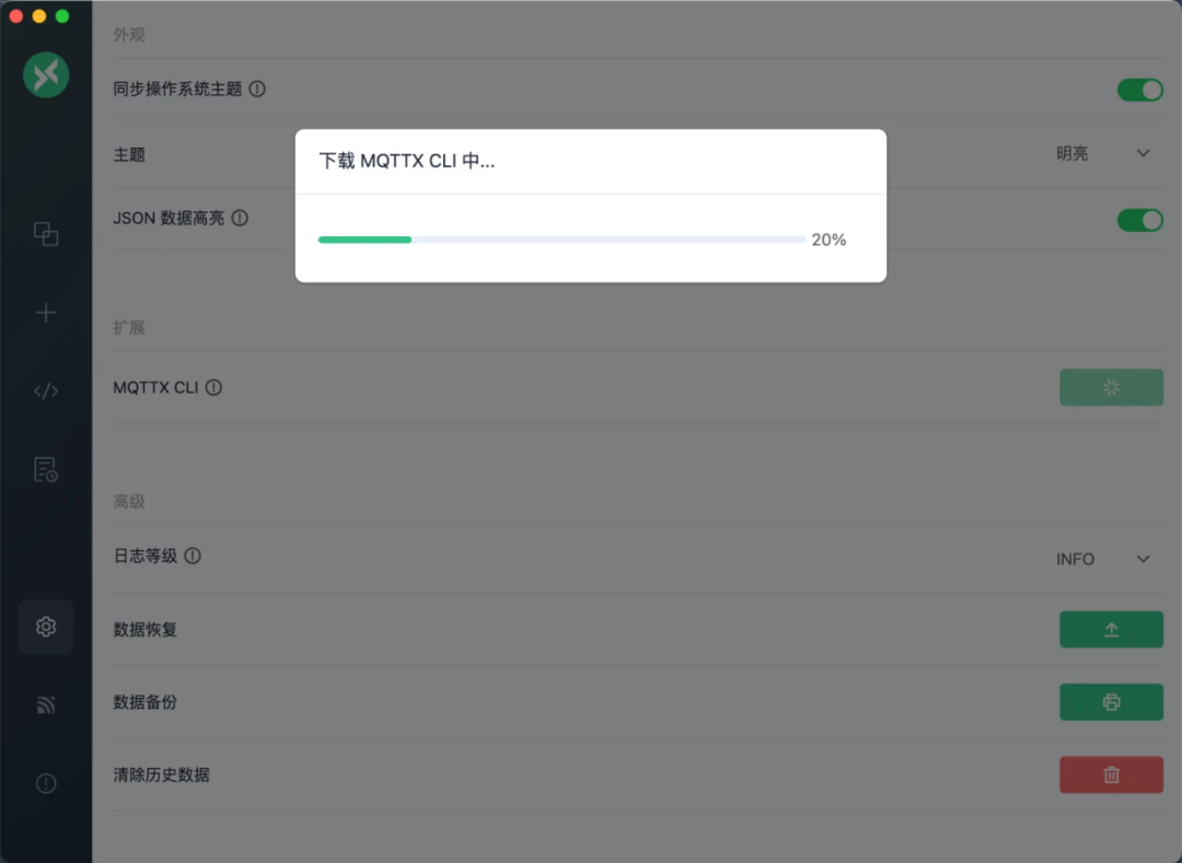 进入设置页面,找到 MQTTX CLI 部分并点击安装按钮。 或者,可以从顶部菜单选择「安装 MQTTX CLI」选项。 点击后,客户端将自动下载并安装所需的系统软件包。您可能需要输入管理员密码以授予安装权限。 安装完成后,您可以在任意命令行窗口中使用 mqttx
