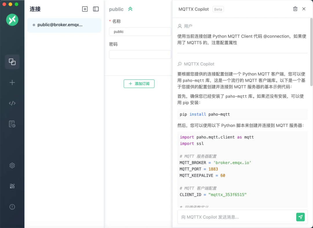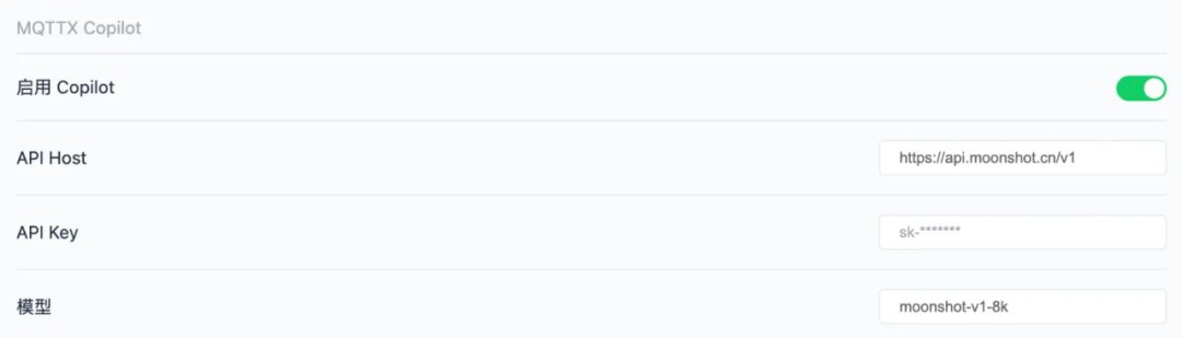 MQTTX Copilot 现在支持内置的 Moonshot API,为中国区域内的用户提供增强的 AI 功能。用户只需获取 Moonshot API 密钥并在设置页面中输入,即可选择兼容的 Moonshot 模型并开始使用。目前支持的模型版本包括 moonshot-v1-8k、moonshot-v1-32k 和 moonshot-v1-128k。配置完成后,用户可以利用这些强大的模型来提升他们的 MQTTX Copilot 体验,包括一键生成测试客户端代码、测试数据等。