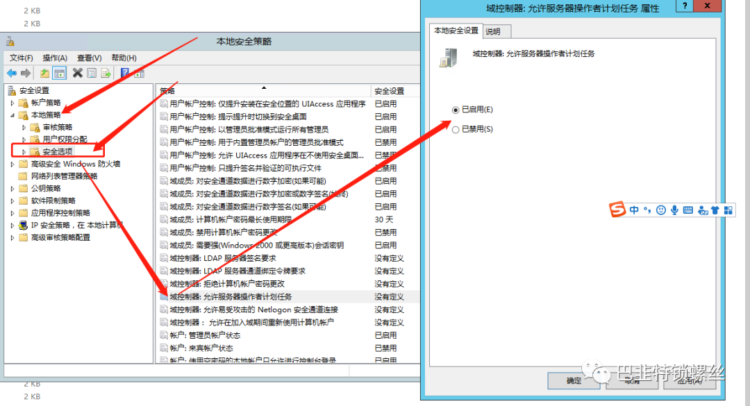 控制面板\所有控制面板项\管理工具,选择“安全设置->本地策略->安全选项”,在右边列表中找到“域控制器:允许服务器操作者计划任务”,将状态改为“已启用”。