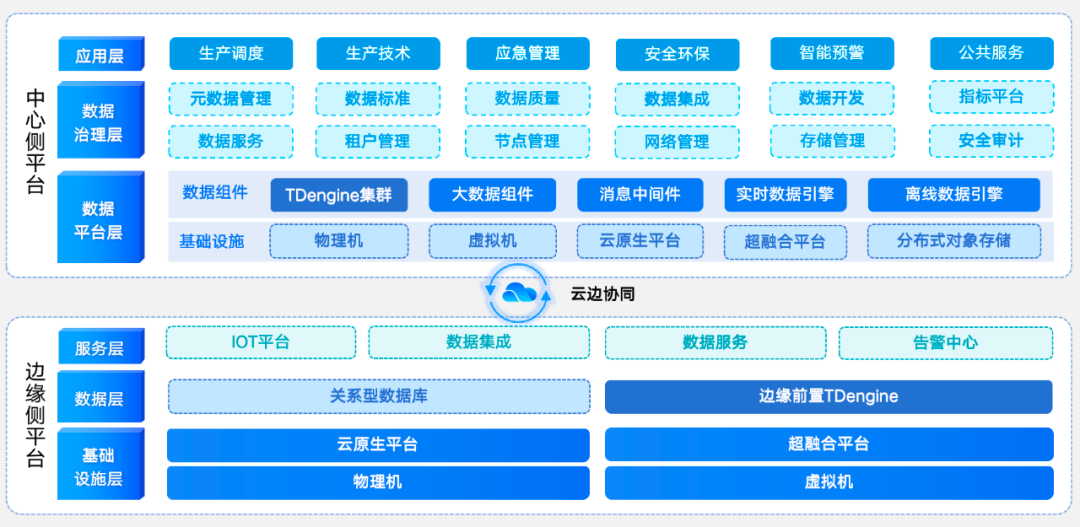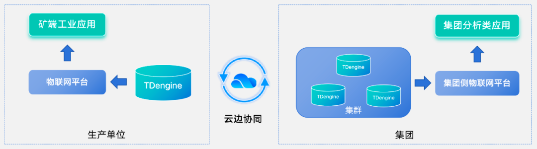 上线支持新版本数据库的数据任务,观察数据任务执行效果,并观察应用侧数据是否一致。运行一段时间并确认数据一致后,停止老版本数据任务的执行,随后停止双写,最后停止老版本 TDengine 运行。 基于上述步骤,该项目成功完成了数据的切换,同时确保了线上系统的正常运行。在综管平台一期项目中,TDengine 正常运行,日增量数据 2.5 亿条,产品稳定性及性能符合既定的设计预期。后续基于 TDengine 构建的工业数据分级预警系统等也成功实现落地。 目前,云鼎科技以TDengine作为物联网平台时序数据存储的核心,构建了云端协同的时序数据存储和传输体系。在满足生产单位的时序数据使用需求的同时也支持了集团时序数据分析应用的建设。在生产单位以及集团均部署了 TDengine 实例,既保障了各方的需求也能够提供最好的性能。