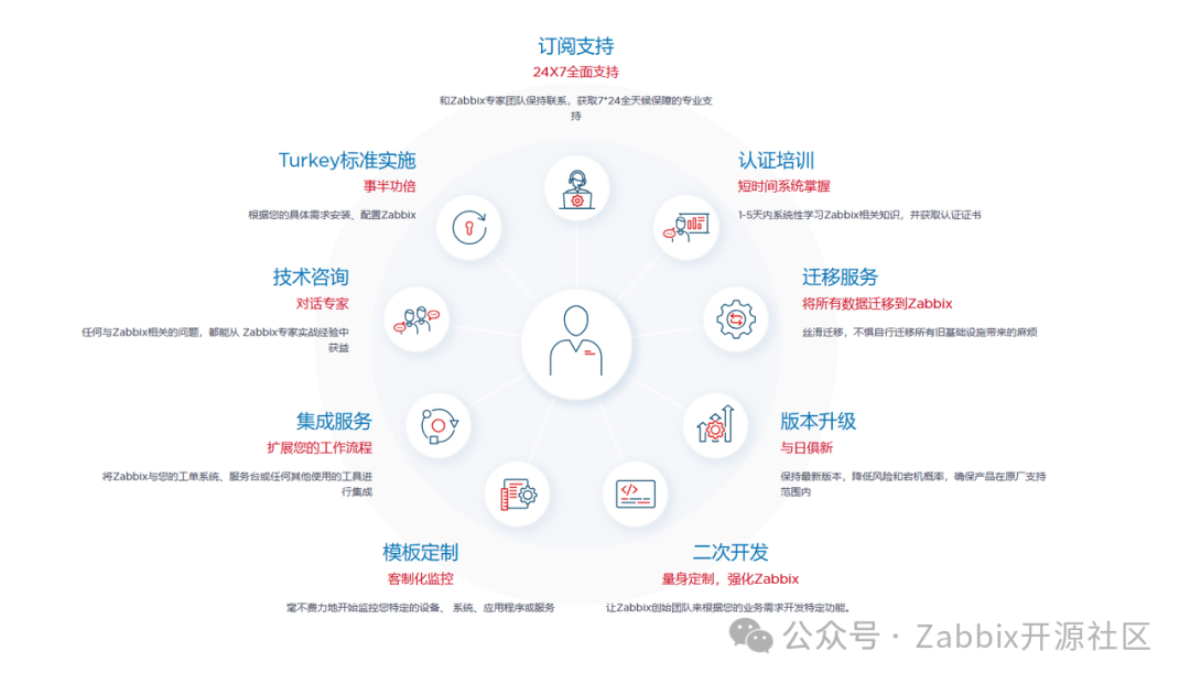 4、社区和服务支持:企业级应用通常需要可靠的支持。Zabbix拥有一个活跃的开源社区,同时提供原厂支持服务,确保用户在使用过程中能够得到帮助,为业务连续不间断提供可靠保证。