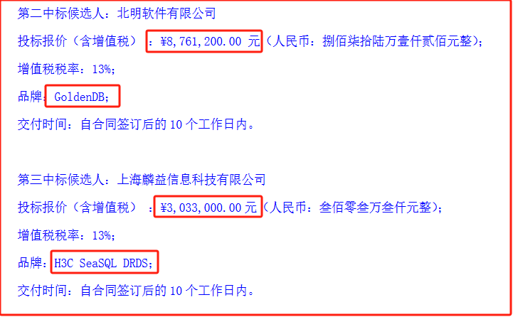 落选产品包括GoldenDB 、H3C SeaSQL,均为代理商投标。
