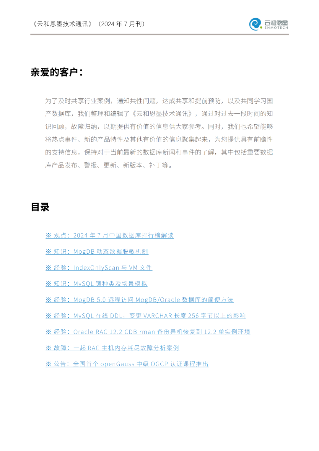 为了及时分享行业案例、通知共性问题、达成共享和提前预防,我们整理和编辑了《云和恩墨技术通讯》,通过对过去一段时间的知识回顾、故障归纳,以期提供有价值的信息供大家参考。同时,我们也希望能够将热点事件、新的产品特性及其他有价值的信息聚集起来,为您提供具有前瞻性的支持信息,保持对于当前最新的数据库新闻和事件的了解,其中包括重要数据库产品发布、警报、更新、新版本、补丁等。