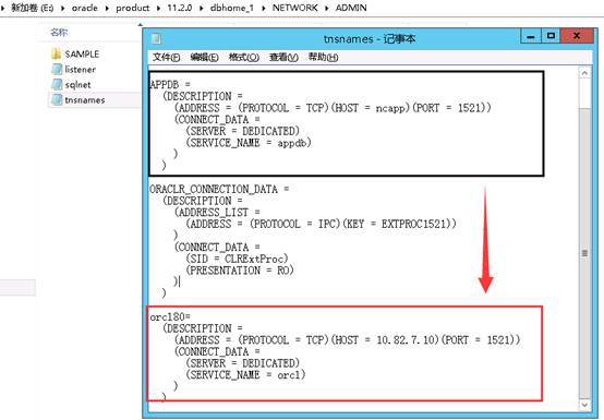 在本地服务器配置到远程服务器的的文件,修改$ORACEL_HOME/NETWORK/ADMIN下tnsnames.ora文件,增加一行(红色框内)