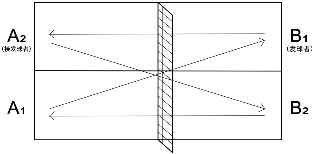 注:图中的箭头只为标明球员的击球次序,不代表乒乓球的运动轨迹。这里B1发球时依旧要发右半区域,所以实战中A队两人的站位会均会更加靠右,A1也会稍微远离球台以留给A2足够的击球空间