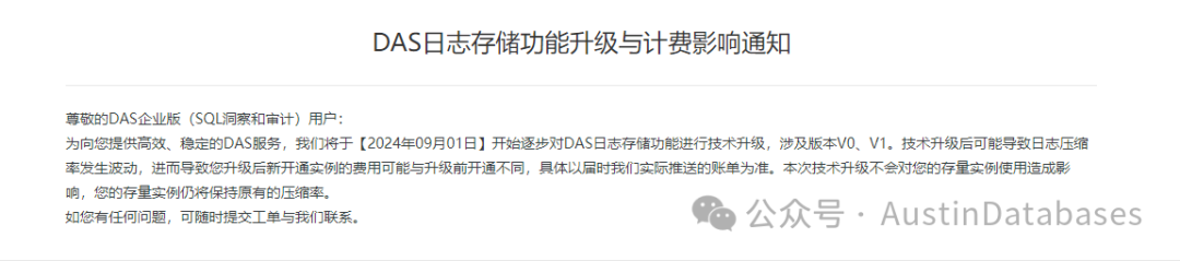这段时间还是比较清静的,可阿里云的数据库就是不让人省心呀,一则DAS日志存储功能升级的通知打破了宁静。