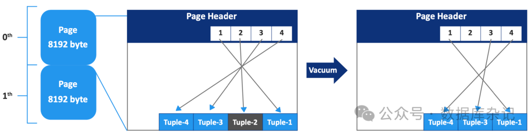 例如,正如您在上图中看到的,一个表有两个页面。让我们把注意力集中在第0页,也就是第一页。该页有四个元组。tuple -2是一个死元组。在这种情况下,PostgreSQL删除Tuple-2并重新排序剩余的元组来修复fragmenta on/bloat,然后更新该页面的FSM和VM。PostgreSQL会在最后一页继续这个过程。