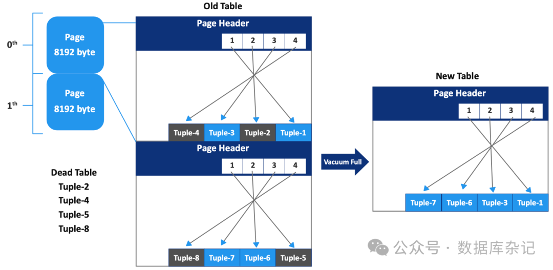 例如,正如您在上图中看到的,一个表有两个页面。第0页有四个元组。Tuple-2和Tuple-4是死元组。第一页也有另外四个元组,Tuple-5和8是死元组。当我们执行Vacuum Full命令时,PostgreSQL开始删除死元组,比如首先为该表获取“AccessExclusiveLock”锁,并创建一个大小为8kb的新表文件。因此,PostgreSQL只将旧表文件中的活动元组复制到新表中,并且在复制所有活动元组时,PostgreSQL删除旧文件,重建所有相关的表索引,更新相关的状态和系统目录。